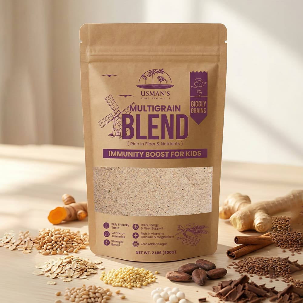 Usman’s Pure Giggly Grains Immunity Booster Blend for kids is a carefully crafted multigrain flour blend designed to provide balanced nutrition, gentle digestion, and natural vitality for everyday health of kids. This premium formulation combines wholesome grains, nutrient-dense legumes, and functional seeds with traditional herbal spices to create a blend that supports digestive wellness, sustained energy, Strong immunity support, Brain development, Bone strength and overall metabolic balance.